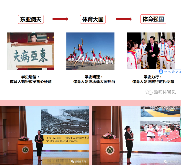 姜小平老师通过“学史增信:体育人始终传承初心使命”、“学史明理:体育人始终承载大国担当”、“学史力行:体育人始终践行时代使命”三个部分讲述了《体育强则中国强,国运兴则体育兴》,生动传达出浙师体育人自觉担当立德树人、教书育人的使命,做健康中国战略的引领者、参与者、实践者。