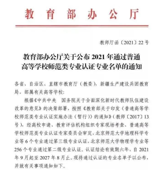 自2021年9月起,到2027年8月止认证结论有效期六年。从2021级新生起可由学校自行组织中小学教师资格考试面试工作通过认证的专业将充分发挥示范带动作用全面落实“学生中心、产出导向、持续改进”的理念扎实推动师范院校特色发展、追求卓越从源头上培养新时代高素质专业化创新型教师。
