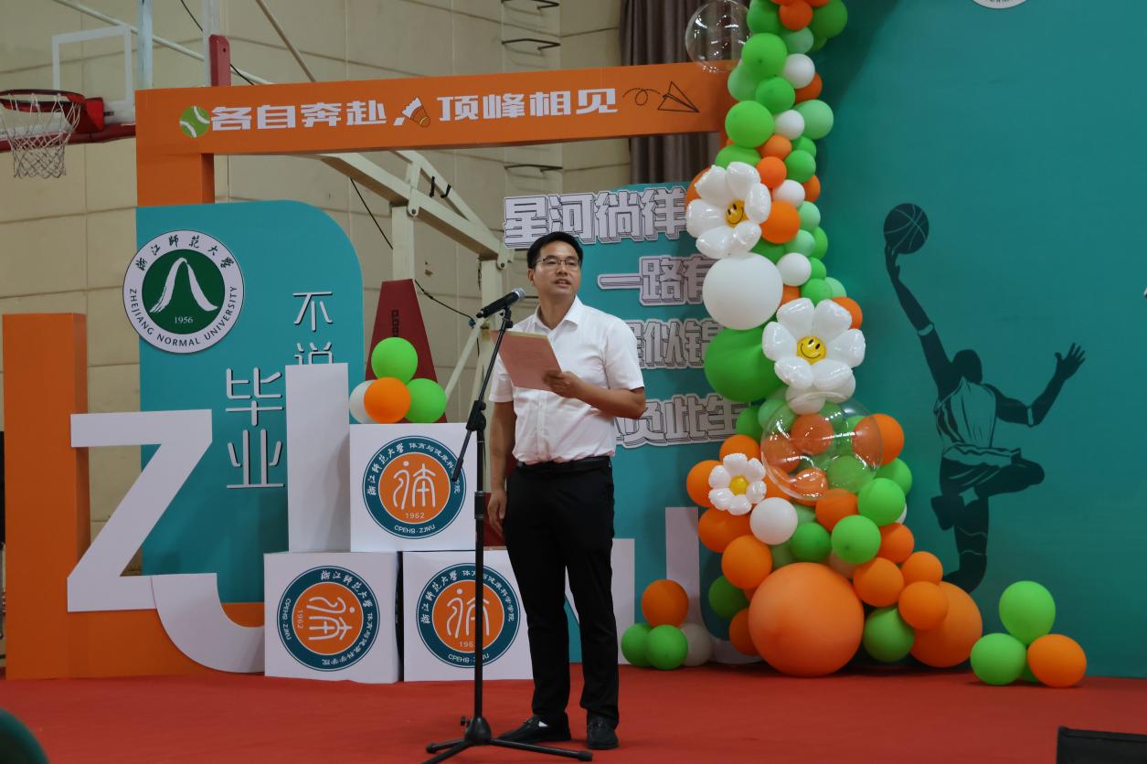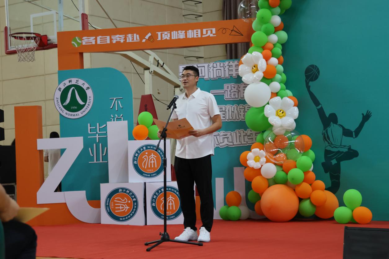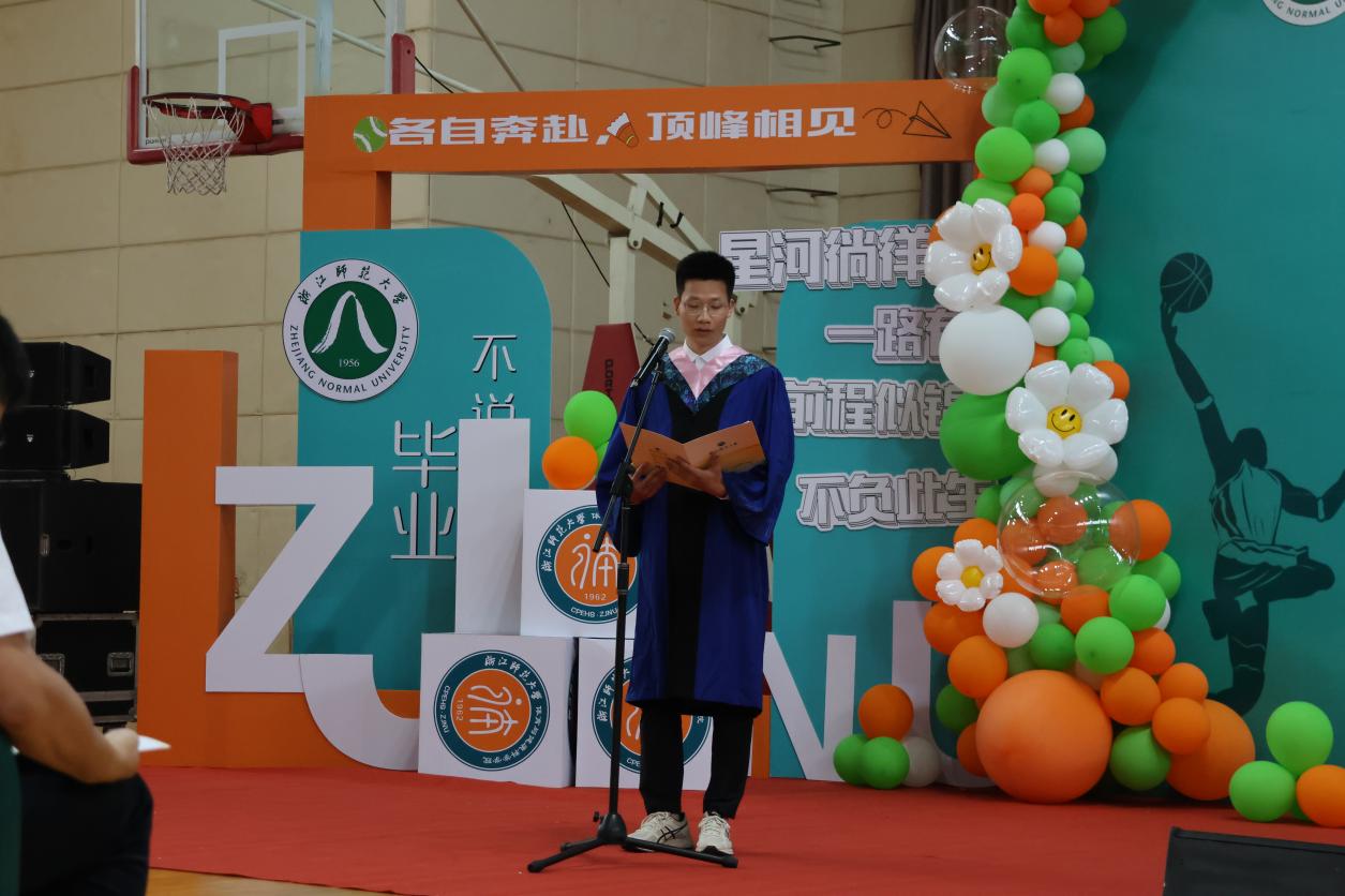 毕业生代表项建松回顾了自己美好的大学生活,也和同学们倾吐了他的心里话。他从自己的家乡皖南小城来到婺江北岸,日月辗转,一千多页的喜怒哀乐匆匆翻过,其中有着无数生动的细节值得留恋,是年少的轻狂,也是失败的迷茫,是“刑天舞干戚”的刚毅,也少不了“不坠青云志”的坚韧。他说人生总有“会当凌绝顶”的风光,但也要满怀着“回首向来萧瑟处”的豁达……学习、经历、历练,成长、告别、启航,项建松同学自比于游子,视学院为第二家乡,他以“荣幸”为名,为在浙师体院的遇见划上了圆满的句号。