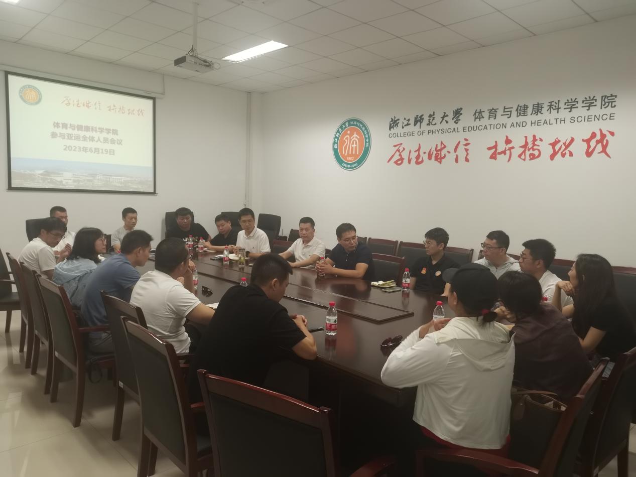 在杭州亚运会进入倒计时冲刺阶段,beat365官网东田径场亚运测试赛临近之际,6月19日上午,学院召开参与亚运人员全体会议,对学院参与亚运全体人员进行再动员、对亚运筹备工作进行再部署,鼓干劲,强信心,号召全体人员以最饱满的热情,最优质的服务投入到亚运筹备工作中去,展浙师风采、展体院风采。院长李启迪、党委书记姜洪友参加动员会并作动员讲话。