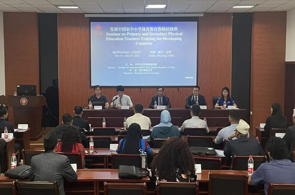 研修过程中,体育学院邀请专家围绕中国中小学体育教育和学校体育国别交流、当代中国国情、传统文化复兴和体育事业发展、中国体育事业(学校体育、竞技体育和休闲体育)发展概况开展专题讲座,围绕日常体育汉语学习进行文化体验,实地参观考察金华城市体育场地设施建设和全民健身工作,为学员们了解中国体育事业发展提供了宝贵的学习机会。