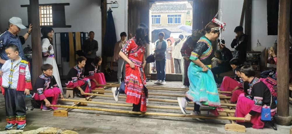 随后,大家换上蓝衫彩带、银饰叮当的畲族传统服饰,教职工们化身“山哈人”。随着竹竿清脆的敲击声,大家踏着节奏轻盈跳跃,笑声与掌声交织成春日欢歌。跟随导游的讲解,在红蓝文化体验中心,教职工们学习扎结、浸染等传统工艺,用板蓝根染料创作独一无二的蓝染方巾。方寸之间,非遗技艺与现代创意悄然融合。