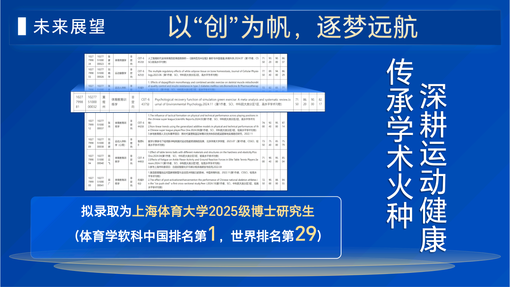 目前,黄煜州已拟录取为上海体育大学2025级博士研究生。未来,他将继续以"运动健康促进"为核心,深耕数字化多感官锻炼的精准干预机制,推动体育科学从群体普惠向个体化精准转型,为运动健康领域贡献自己的绵薄之力。“少即是多,慢既是快”这是黄煜州同学的学术座右铭,未来他将继续以"慢"为舟,以"创"为帆,书写体育科学的创新篇章。