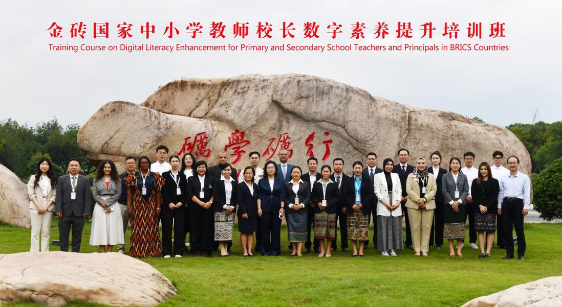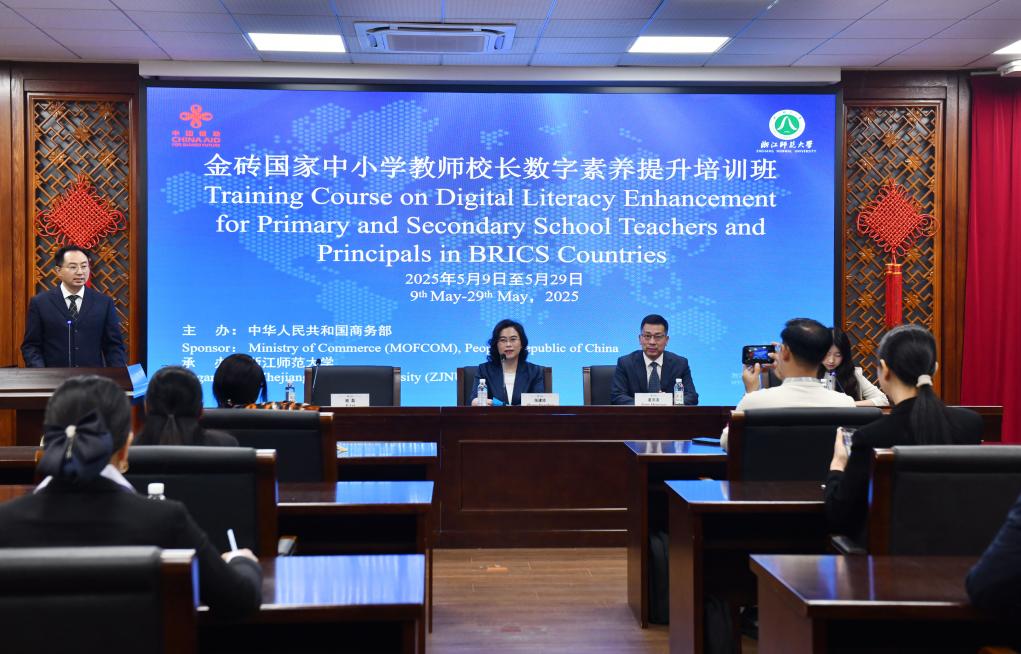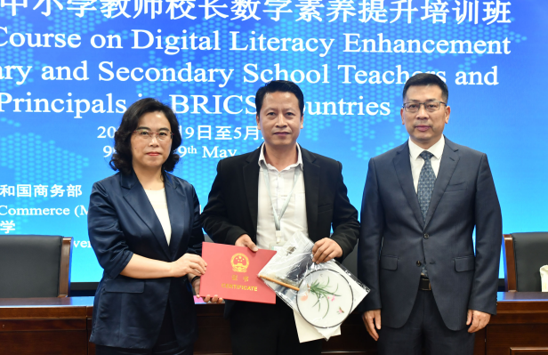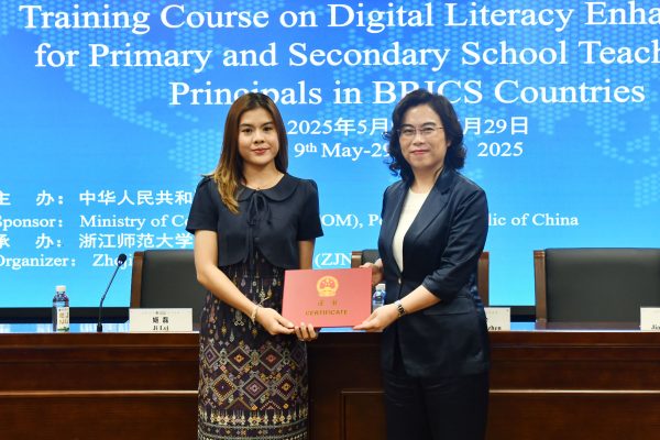 5月29日上午,由中华人民共和国商务部主办、beat365正版唯一官方网站承办的“金砖国家中小学教师校长数字素养提升培训班”结业仪式在浙师大举行。浙师大副校长张建珍教授出席并致辞,体育学院党委书记姜洪友以及来自埃及、老挝、泰国、塞拉利昂等4个国家的19名学员参加。