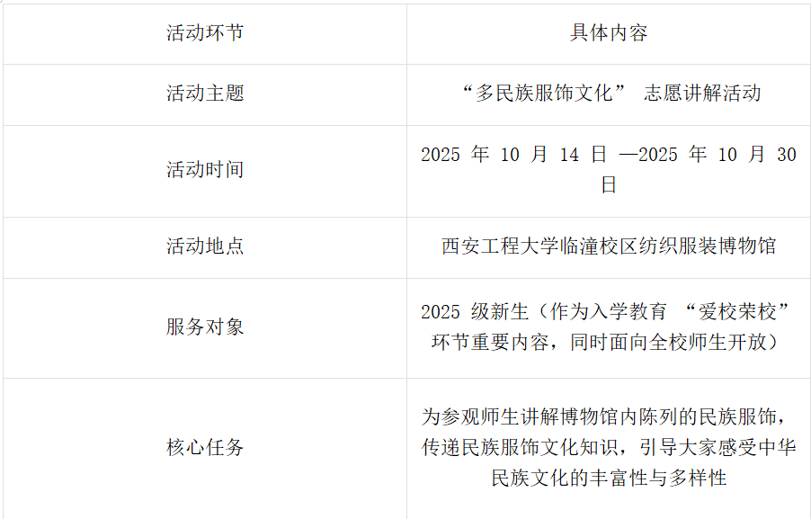你是否曾在博物馆里,为一件精美的民族服饰驻足?是否好奇苗银的叮咚、云锦的流光、艾德莱斯绸的绚烂背后,藏着怎样的历史故事与文化密码?现在,一场深度触摸民族服饰文化的机会正向你招手——西安工程大学“多民族服饰文化”志愿讲解活动正式招募,邀你成为文化传承的“发声者”!