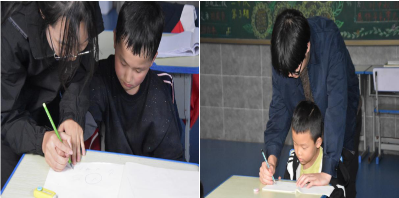 “小朋友们,握笔时要轻轻发力,墨色浓淡可以通过手腕的力度来控制哦!” 在美术课堂上,志愿者罗仕丽、王甲怡化身 “美育导师”,通过手把手教学,耐心引导孩子们感受传统水墨的独特魅力。从握笔姿势的纠正,到墨汁调配的技巧,志愿者们细致讲解每一个环节。阳光透过窗户,映照在孩子们专注的脸庞上,笔尖在宣纸上徐徐游走,淡墨痕迹随之晕染开来,或化作灵动的小鸟,或变成绽放的花朵,或勾勒出充满童趣的房屋。当孩子们举起自己完成的画作,眼中闪烁着自豪与喜悦的光芒,艺术的审美与创造的快乐,在笔墨流转间悄然传递。