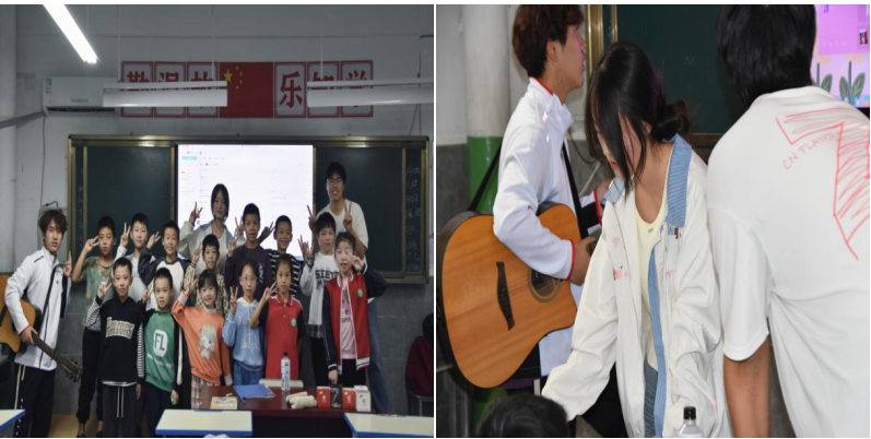 “叮 ——” 随着志愿者刘博菲指尖拨动吉他弦,清脆悦耳的旋律在音乐教室中流淌,瞬间吸引了所有孩子的注意力。作为本次音乐课的 “主力”,刘博菲以孩子们熟悉的儿歌为切入点,用简单易懂的方式讲解节奏与旋律的基础知识。志愿者张雅馨、胡旗钊主动配合,一边引导孩子们跟唱,一边用肢体动作模仿歌词中的场景,让课堂氛围愈发活跃。“门前大桥下,游过一群鸭……” 孩子们跟着旋律放声歌唱,稚嫩的歌声与吉他声交织,汇成最动听的乐章。课程接近尾声时,孩子们纷纷向志愿者竖起大拇指,用最直白的方式表达喜爱。离别之际,志愿者与孩子们在教室前排签名合影,定格下这段充满歌声与欢笑的美好时光。
