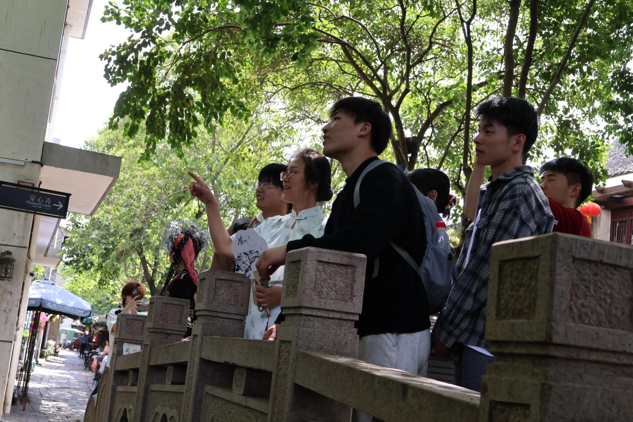 日影西斜时,师生漫游古镇街巷。穿心弄的窄巷仅容一人侧身,青苔斑驳的墙面上,同学们发现明代“水则碑”的残迹;三桥畔的茶楼里,同学们看到乌篷船划过,惊起一串涟漪,倒映着廊檐下的红灯笼,恰似一幅动态的《姑苏繁华图》。