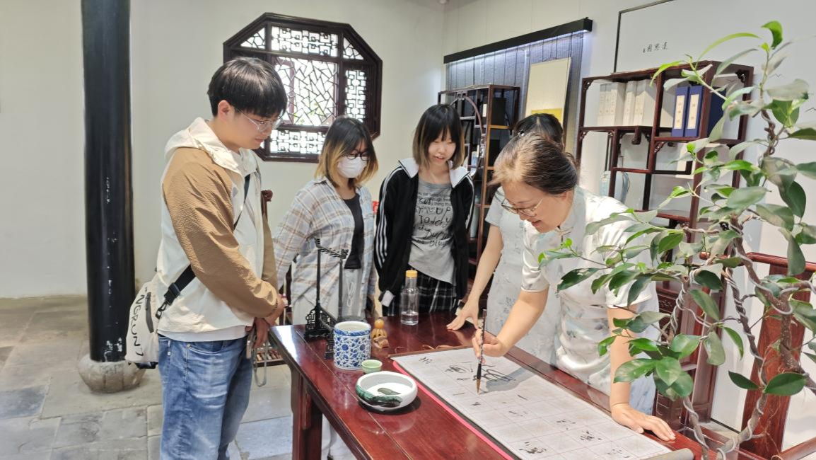 在“南园茶社”,同学们与老茶客共饮碧螺春,记录茶桌的榫卯结构与天井的光影变化。这些木纹的包浆,比任何教科书都更生动。同学轻触桌面的岁月痕迹,感慨万千。