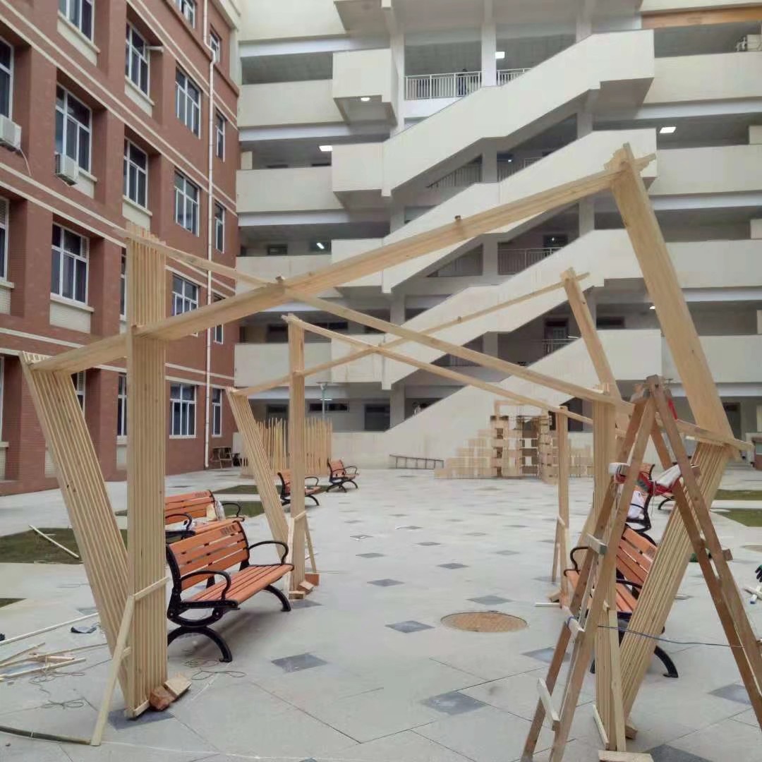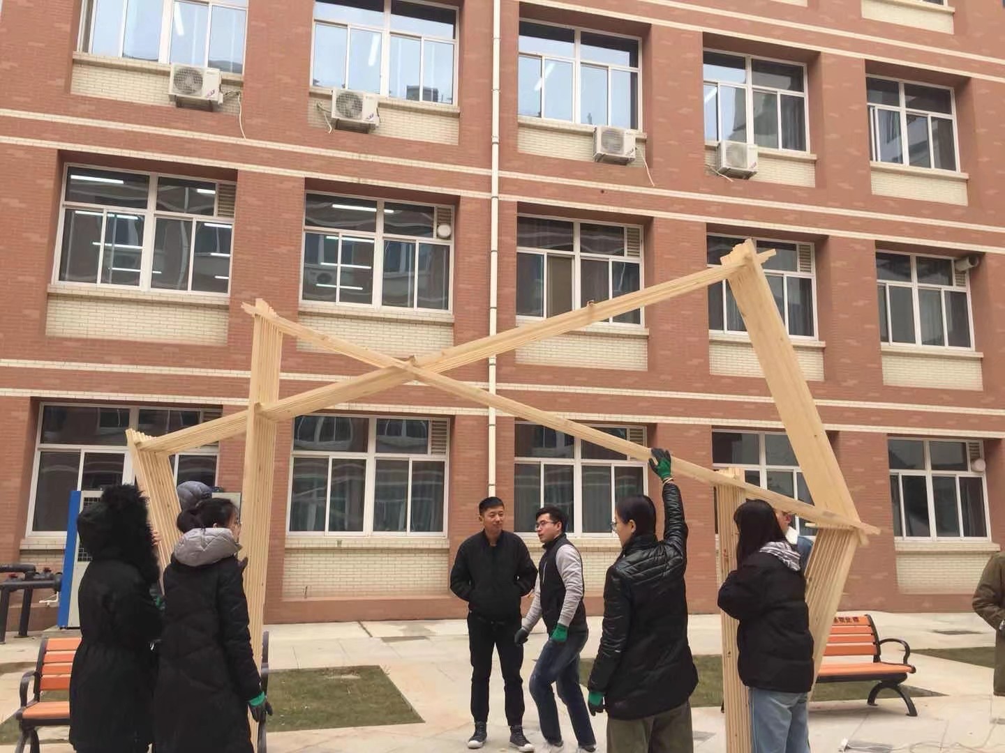 本次展示的实体搭建作品是《廊桥遗梦》、《枝生·枝伸》、《禅悦境土》、《尺度·方寸》、《飞鸟与鱼》、《白桦林》、《回转》、《修竹亭》共八组。每组作品使用的搭建材料各不相同,作品《修竹亭》利用竹子的“韧性”搭建建筑,体现了绿色环保的理念;作品《飞鸟与鱼》加装了光源效果,展现出充满童趣的设计感。每组作品是由12名学生共同协作完成的,通过本次综合设计实践周的搭建,使学生们进一步掌握了环境景观设计的基本方法,增强了处理实际问题的能力,培养了学习的兴趣,大家的团队协作能力和项目沟通能力也得到了提高。