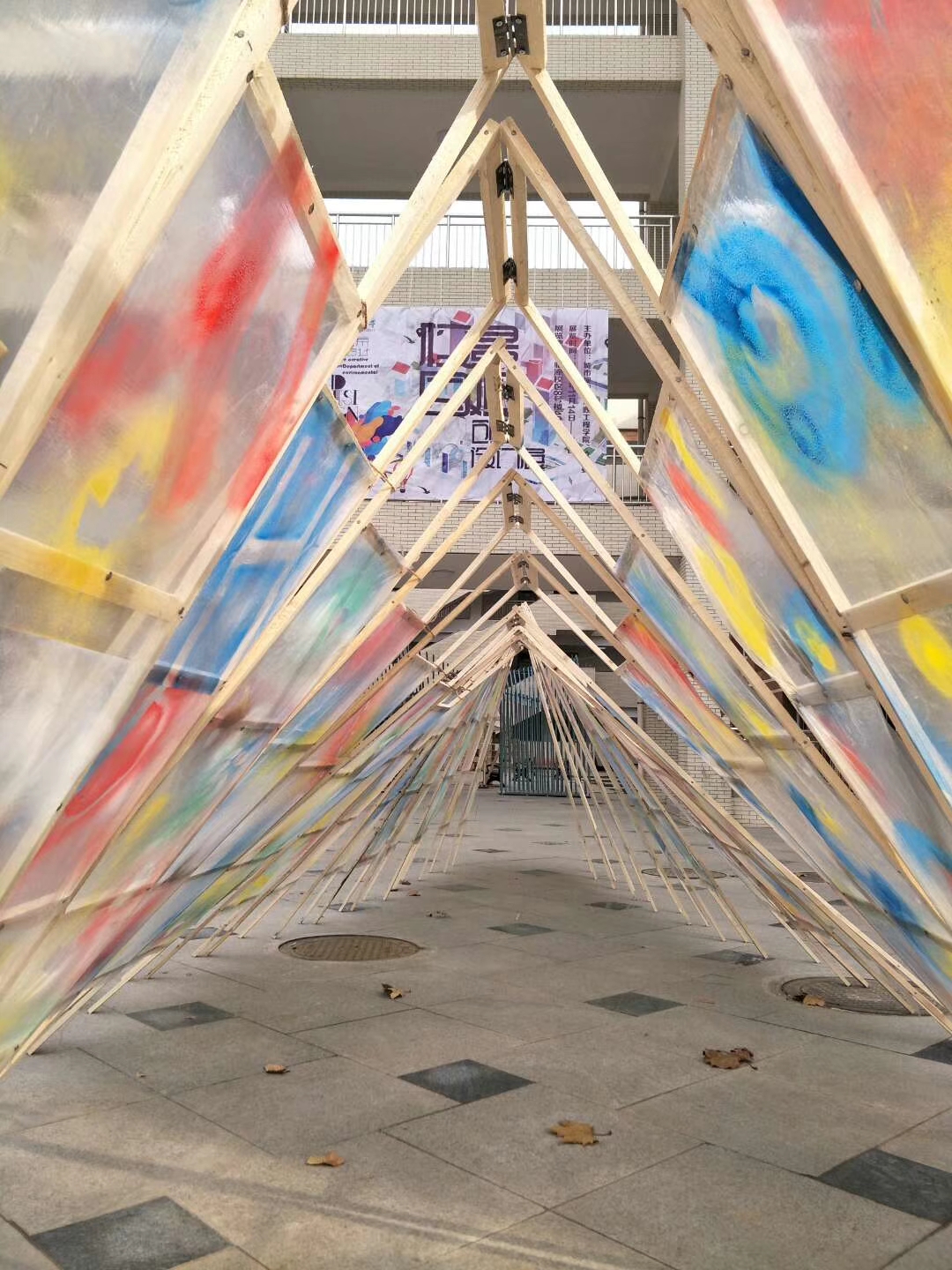 本次展示是景观艺术系环境设计专业综合设计实践课的成果展示,旨在结合建筑设计基础、建筑构造、立体构成等课程内容,融合人体尺度、力学结构及造型设计与建造等知识进行感知设计,使学生在完成作品的过程中,获得对材料及构造过程的感性及理性认识,掌握使用功能空间,掌握材料形式与表现,理解支撑结构与构造,对空间建筑方式及方法等拥有全面的认知。实体搭建作品的教学过程分为绘制设计方案与制定建造程序计划、提交设计图纸并建造实施、活动体验、教师测评四个环节,最终通过专业老师的现场教学指导完成作品。