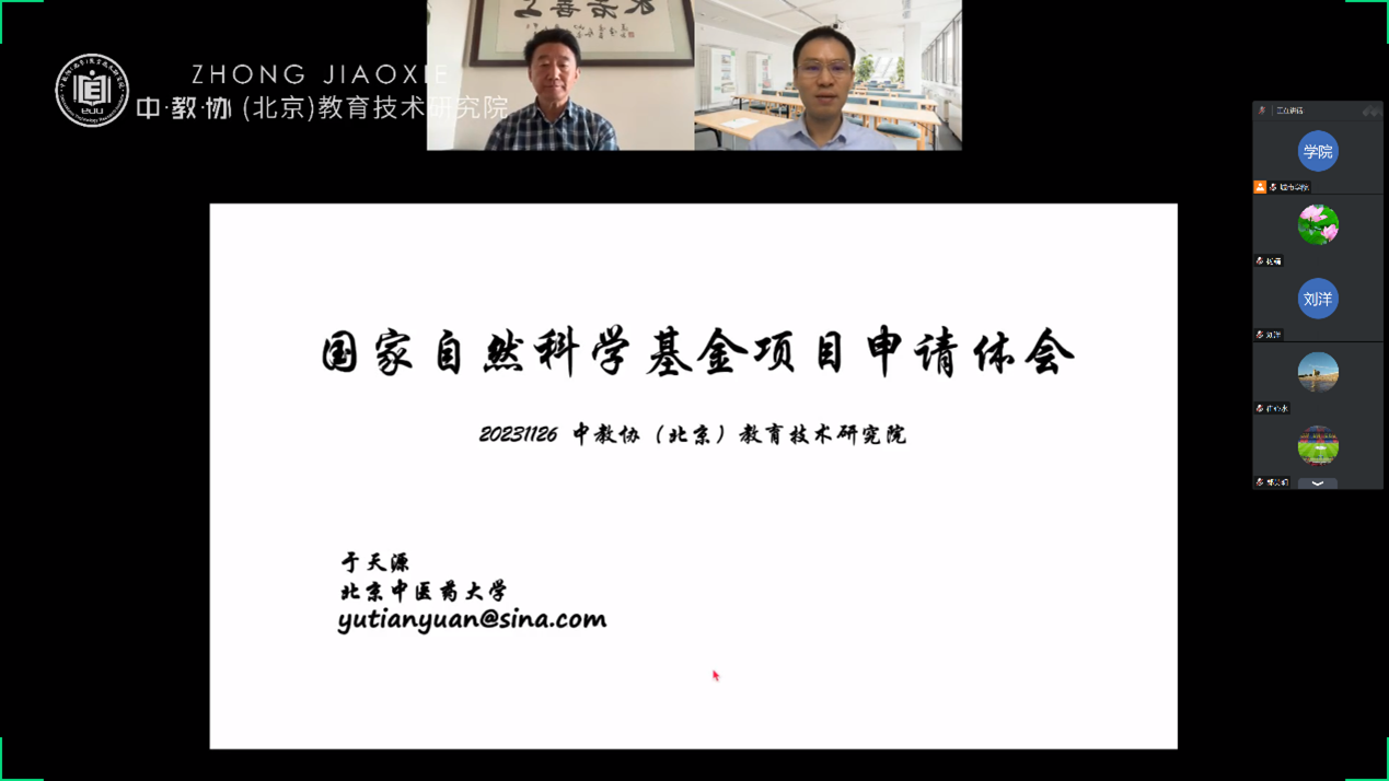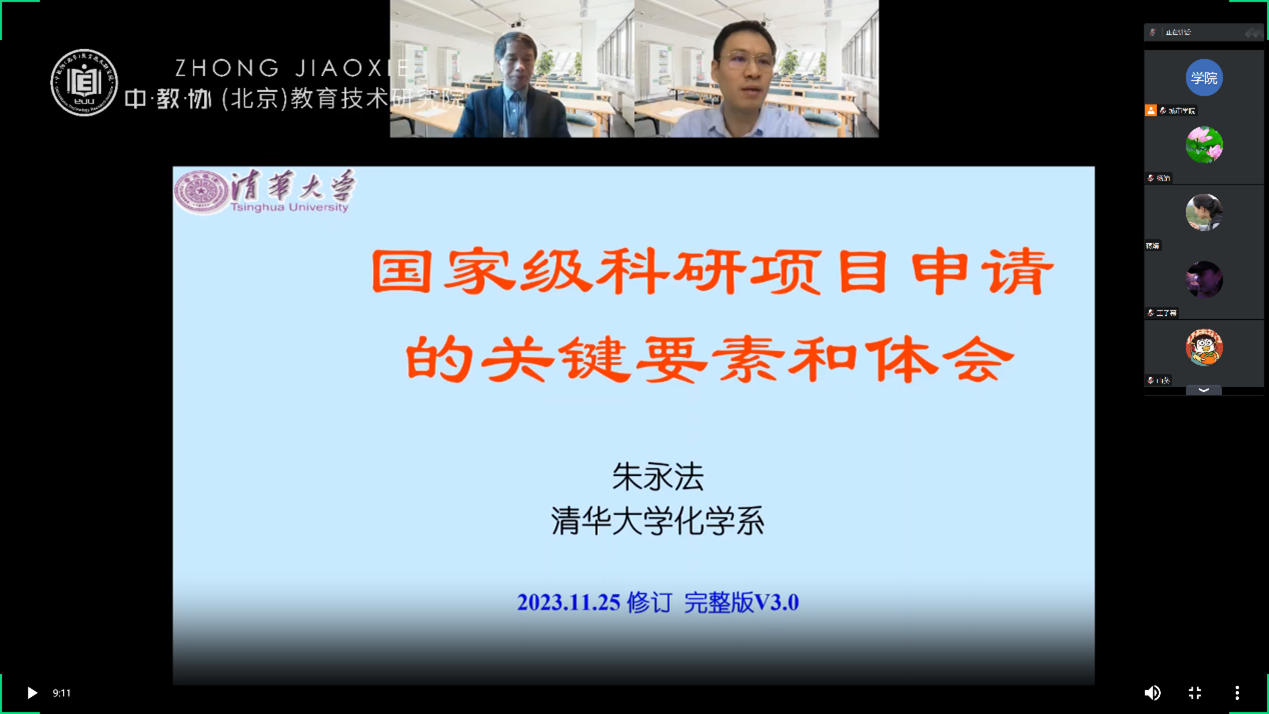 参会教师集体听取了由中国科学院人才交流开发中心组织的“2024年度高校国家自然科学基金项目申请专题线上培训会”。会议中朱永法教授和于天源教授对国家自然科学基金项目的选题、研究内容、创新性等方面进行了详细的讲解和解答,同时还分享了自己在科研项目申请和管理方面的经验和心得。