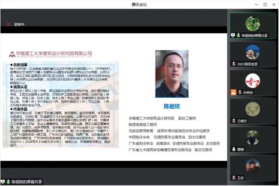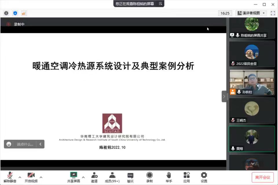 2022年10月25日,应beat365中文登录入口邀请,华南理工大学建筑设计研究有限公司陈祖铭工程师为学院师生做了“暖通空调冷热源系统设计及典型案例分析”的线上专题讲座。讲座由建环系系主任孙铁柱主持,学院建环系教师、本科生以及研究生聆听了讲座。