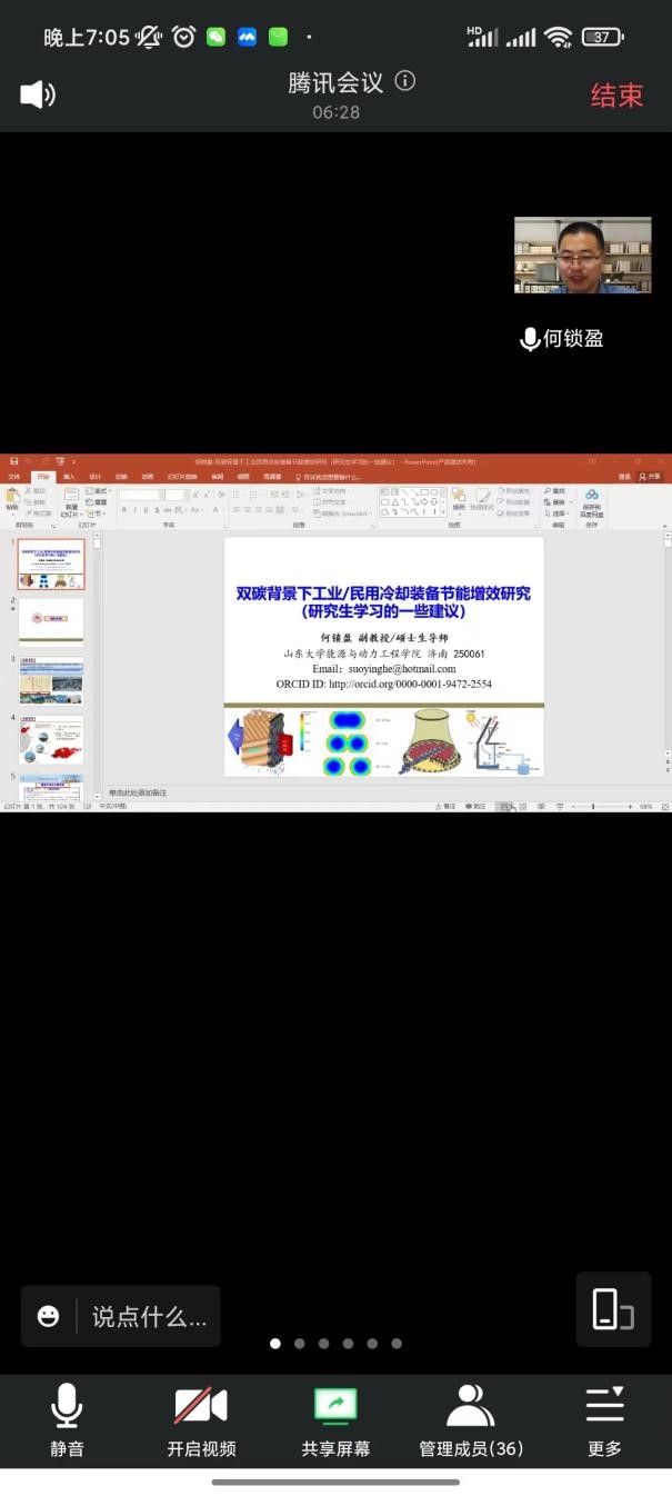 2022年6月29日,beat365中文登录入口“双碳背景下工业与民用冷却装备节能增效研究”学术报告会于线上举行,山东大学副教授、研究生导师何锁盈应邀为学院建筑环境与能源应用专业研究生做了报告。