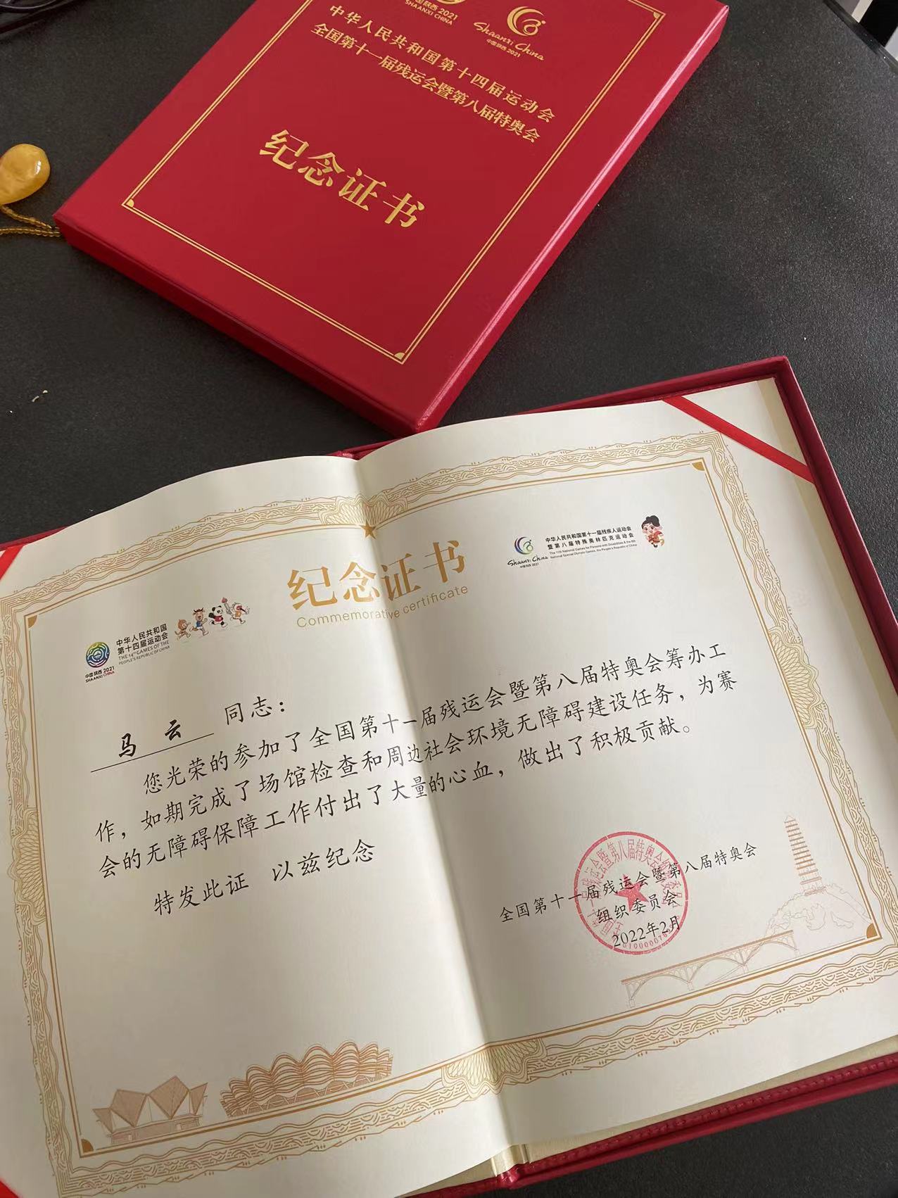 全国第十一届残运会暨第八届特奥会于2021年10月在西安举行,西安工程大学临潼校区文体馆是比赛场馆之一。马云教授作为专家被聘为全国第十一届残运会暨第八届特奥会无障碍专家指导委员会委员,参加了两会的筹办工作,为赛事的无障碍保障工作做出了积极贡献。据悉,同时被颁发纪念证书的还有其他15位省内外专家。