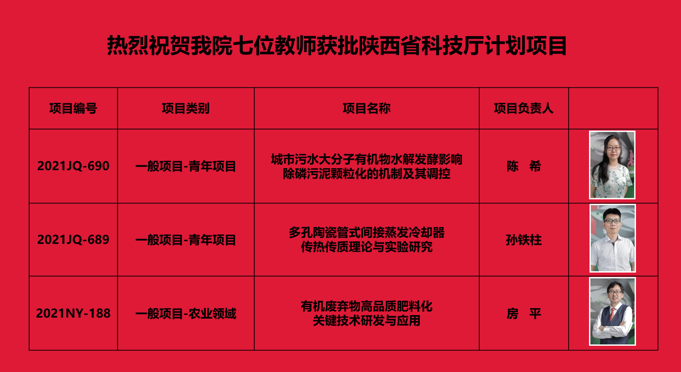 近日,beat365中文登录入口陈希、孙铁柱、房平、王雪艳、郭英明、李红玑、颜苏芊等7位教师申报的项目,获批2021年陕西省科技计划项目。