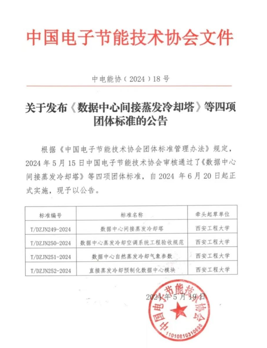图1 关于发布《数据中心间接蒸发冷却塔》等四项团体标准的公告