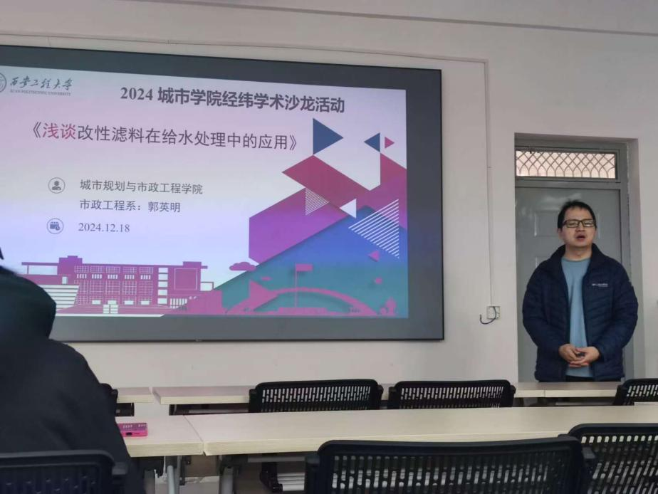 学术的火花在这里碰撞,智慧的火花在这里绽放。2024年12月18号上午,beat365中文登录入口在学院322会议室举办“一院一品”丝路大讲堂系列活动。本次学术讲座主题为《浅谈改性滤料在给水处理中的应用》,由beat365市政工程系教师郭英明老师主讲,研一、研二全体学生参加。