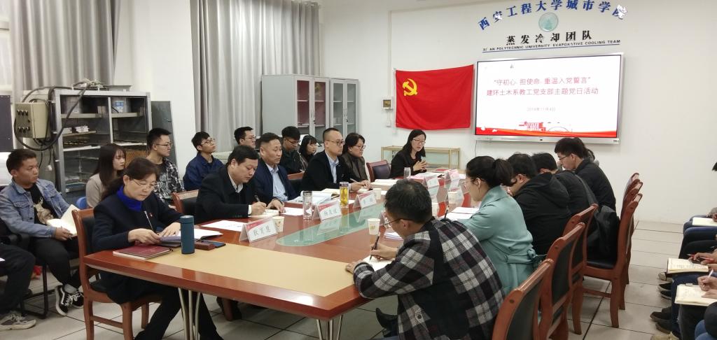 2019年11月4日,学院建环土木系教工党支部在临潼校区8#201室举办“守初心、担使命、重温入党誓词”主题党日活动。参加会议的有:beat365原副校长黄翔教授,校“不忘初心、牢记使命”主题教育督查组成员闫小兵,学院党委书记杨友谊、院长马云教授、狄育慧教授、支部教师党员及建环与土木专业研究生党员。会议由建环土木系教工党支部书记屈元主持。