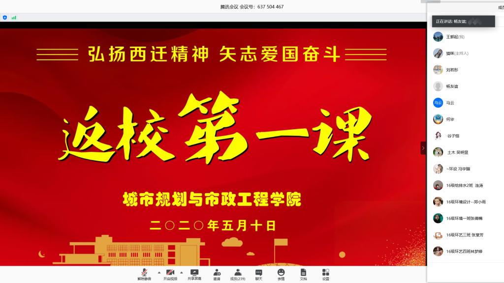 5月9日,城市学院迎来首批返校学生。5月10日晚,城市学院师生以线上直播的方式同上“返校第一课”,听西安交大西迁老教授讲述爱国奋斗先进事迹,学习习近平总书记在西安交通大学考察调研重要讲话精神,介绍学校疫情防控和教育教学相关工作安排。西安交大西迁老教授卢烈英、学院党政领导班子成员、教师代表、全体辅导员、学生党员代表、红色文化学习班学员代表以及学院全体返校学生参加了活动,学院党委副书记袁群主持活动。
