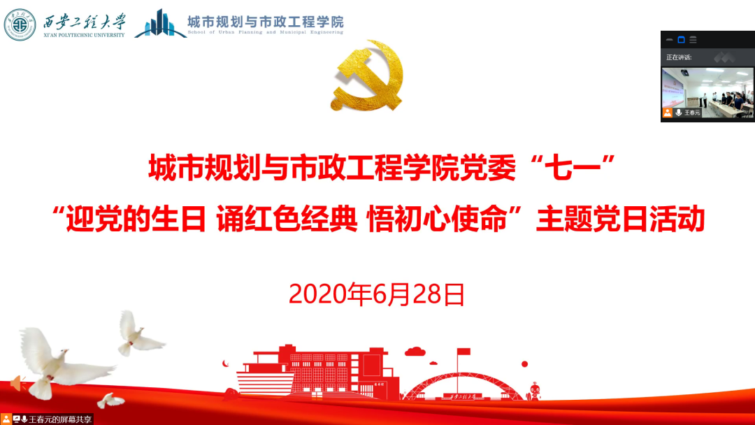 2020年6月28日下午,beat365中文登录入口在学院红色文化图书室(8-322室)举行“迎党的生日诵红色经典守初心使命”的主题党日活动。活动采取线上与线下同步开展的方式,学院党政班子成员、建环系黄翔教授、赵娟博士、全体辅导员及16级56期在校本科生党员参加了线下的现场活动,线上参加活动的有学院全体师生党员。活动由重温入党誓词、发放捐款收据、诵读红色经典三个环节构成。党日活动由学院党委书记杨友谊主持。