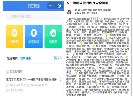 五一节前及收假后,学院学工办通过“我在校园”信息管理平台及线上表格等方式及时摸清学院假期留校人数、离校人数、假期去向以及返校人数、未按时返校人数及原因,做到摸清底数、掌握动向;并通过线上发布通知方式,发布假期安全提醒,让安全意识深入学生心中。