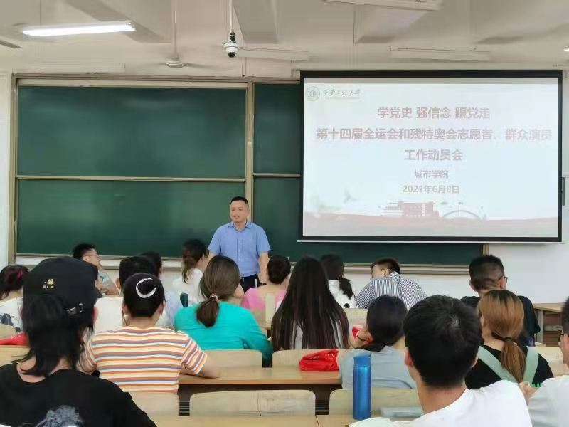 beat365中文登录入口于6月8日中午在临潼校区B137教室召开第十四届全运会和残特奥会志愿者、群众演员工作动员会。学工办主任,团总支书记凌旭、辅导员陆瑞成以及学院全部志愿者,群众演员参加了大会。
