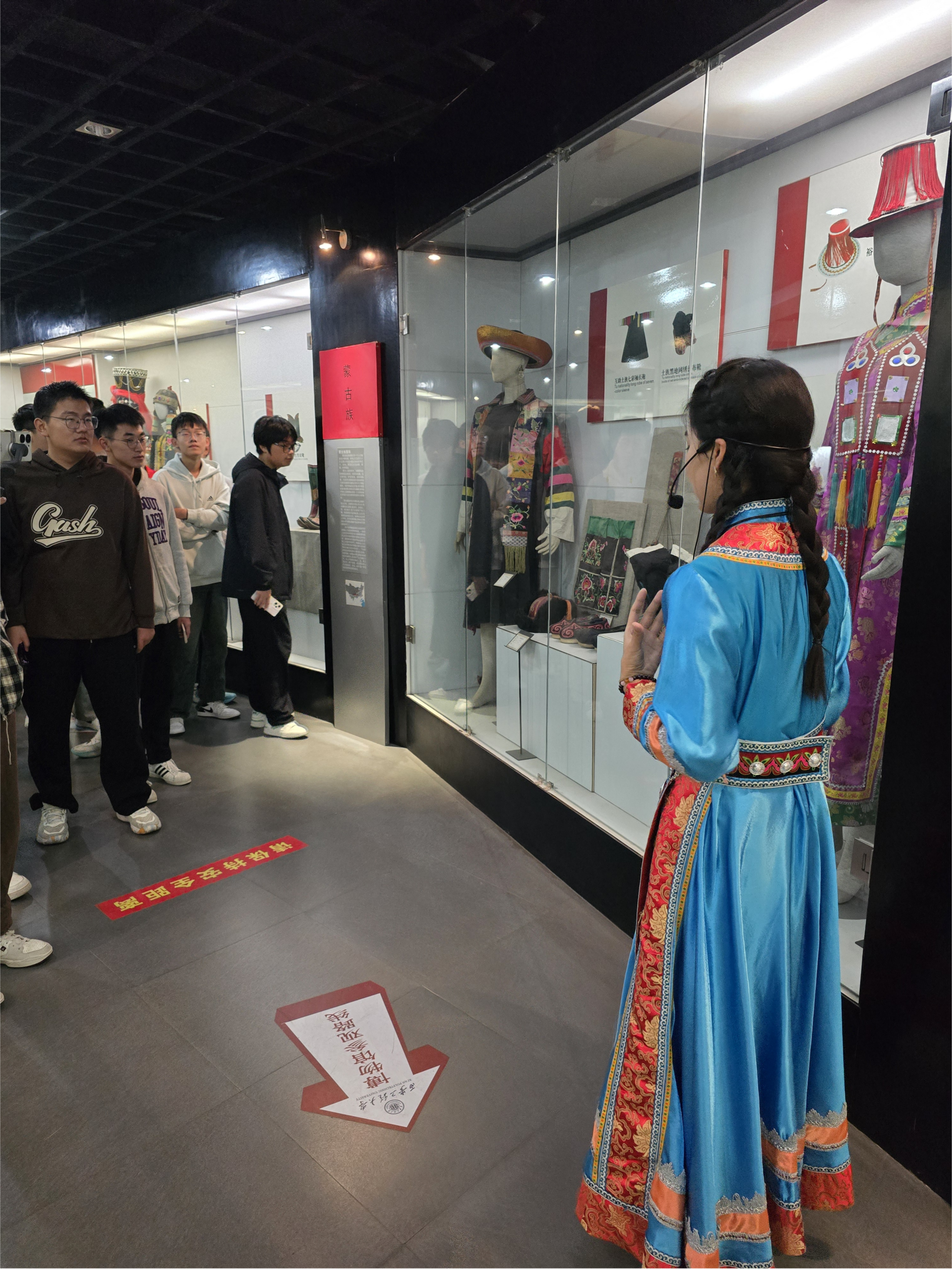 乌孜别克族讲解员城市学院赵志聪同学,接引参观学生,引导学生参观了蒙古族展柜、乌孜别克族展柜,以及重点展品。如:凤穿牡丹、蟒袍、印花模具等等。