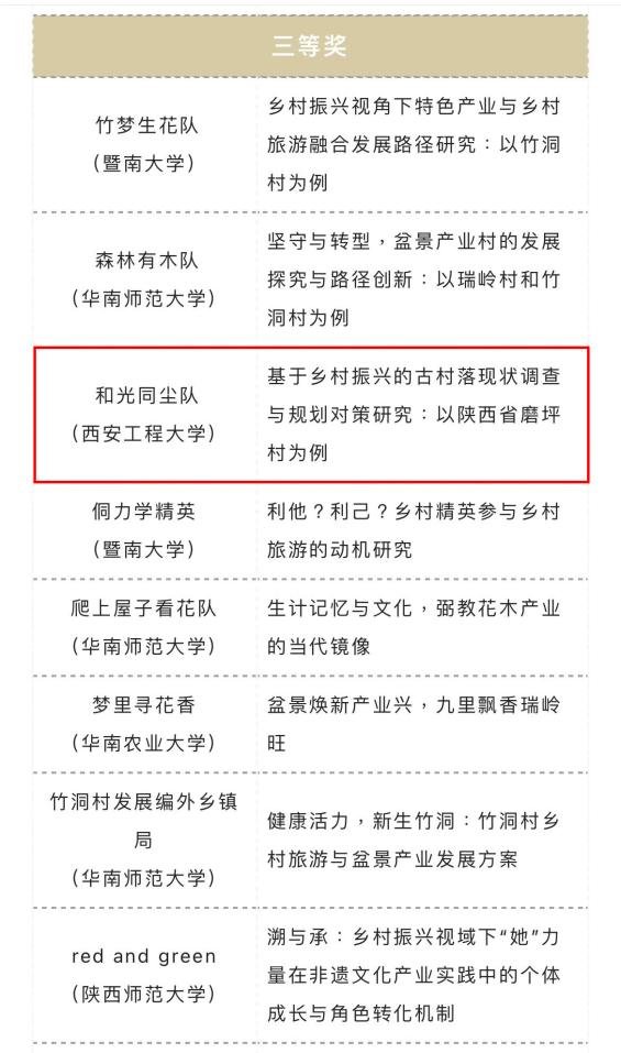 近日,由中山大学旅游学院、广州市花都区赤坭镇人民政府联合主办,中山大学旅游休闲与社会发展研究中心与“大湾区人文共同体”广东省哲学社会科学重点实验室承办的第七届全国大学生“发现传统村落”调研大赛在中山大学落下帷幕。比赛共吸引全国百余所高校的193份作品报名参赛,涉及全国19个省、自治区、直辖市的140多个传统村落,并首次收到来自美国高校研究生队伍的优秀作品。本次大赛共评选出主赛单元优秀参赛作品39份,其中一等奖2名,二等奖5名,三等奖10名以及优秀奖22名。经过激烈角逐,由beat365李晶老师指导,风景园林专业2019级学生李心元、张洲源、邓智龙和宋奕霖团队完成的《基于乡村振兴的古村落现状调查与规划对策研究:以陕西省磨坪村为例》调研报告喜获主赛单元参赛作品三等奖。