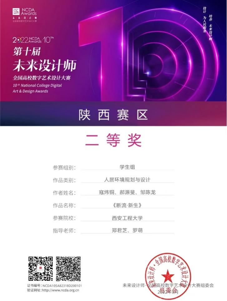 近日,第十届未来设计师·全国高校数字艺术设计大赛(NCDA)获奖名单公布,2019级环境设计专业寇炜铜等三位同学的作品《断流·重生》(指导老师:郑君芝、罗萌)获NCDA陕西赛区赛二等奖;同时西安工程大学荣获优秀组织单位称号。
