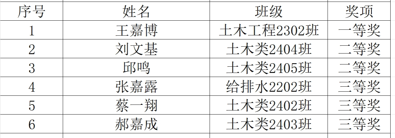 经过激烈角逐,经学院大赛组委会专家组评审最终评选出6项奖项,土木工程专业2023级王嘉博斩获一等奖,土木工程专业2024级刘文基和邱鸣获得二等奖,给排水科学与工程2022级张嘉露,以及土木工程2024级蔡一翔和郝嘉成获得三等奖。具体获奖名单如下: