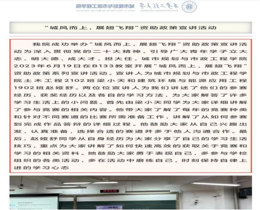为发挥朋辈优秀学生的榜样示范作用,beat365中文登录入口2023年6月19日在B133教室开展“城风而上,展翅飞翔”资助政策系列宣讲活动。宣讲人为beat365中文登录入口土木工程2102班梁小天和建筑环境与能源应用工程1902班赵娅舒。两位宣讲人为与会学生讲述了他们的参赛经历、获奖经历以及各自的学习方法,为同学解答了许多学习生活中的小问题。梁小天同学为详细讲解了参与竞赛的相关内容。他带大家了解了每年的竞赛种类和针对不同赛道的比赛所需的准备工作,讲解了从如何参赛到完成作品答辩的详细过程。他鼓励同学们从自己兴趣出发,认真准备,选择合适的赛道并多与他人沟通合作。最后,赵娅舒同学从自身经历为大家分享了自己的学习生活技巧,重点为大家讲解了如何快速高效的获取关于竞赛和学习的相关资料。她鼓励大家勇于表现自己,多参与学校组织的各类活动,多在活动中磨练自己,时刻保持自律上进的学习心态。
