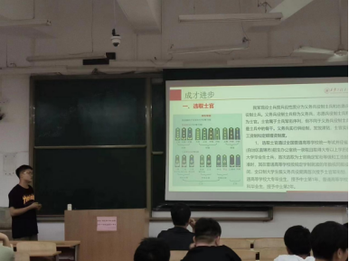 两位宣讲人为我们讲述了大学生征兵政策和他们热血无悔的军旅生涯。宣讲伊始,两位同学特别强调了应征入伍的重要意义。军队生涯充满各种挑战和机会,出征、搜救等任务需要士兵在紧张的环境下做出决策和应对各种问题,这些经历可以锻炼士兵的勇气和决断力。除此之外,军队具有非常完善的培训和教育体系,可以帮助士兵获得各项技能和知识,提升其领导力。最后,宣讲人全面讲解了入伍的相关条件,如身体素质、年龄、学历、政治面貌等,宣讲了入伍保障、部队发展、退役安置等一系列优惠政策,使同学们对应征入伍政策有了全面认识。最后两位宣讲人以图片和视频的形式向与会同学展示了我国的军事力量的发展和充满挑战性的训练日常,让同学们深入而细致地了解真实的军旅生活。