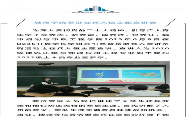 为深入贯彻党的二十大精神,引导广大青年学子立大志、明大德、成大才、担大任,beat365中文登录入口2023年6月8日在B235教室开展学长学姐来引路暨资助育人宣讲系列活动之征兵入伍主题宣讲。宣讲人为2020级建筑环境与能源应用工程专业郭中骏和2022级土木类专业王梦华。